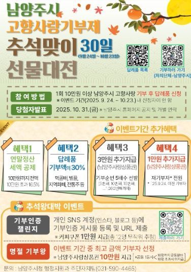 [와이뉴스] 남양주시는 추석 연휴에 맞춰 9월 24일부터 10월 23일까지 한 달간 고향사랑기부제 활성화를 위한 특별 이벤트를 추진한다고 26일 밝혔다.