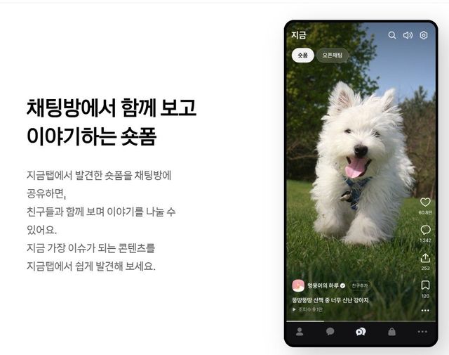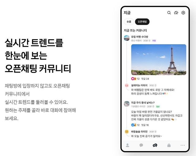 커뮤니티 기능도 강화됩니다. 기존의 오픈채팅탭이 '지금탭'으로 변경되면서 피드 중심으로 오픈채팅방을 확인할 수 있게 된 것이죠. 숏폼 공유 기능이 더해지면서 동영상을 실시간으로 공유하면서 대화를 주고받을 수 있게 된 것도 주목할 만합니다.