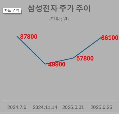 삼성전자의 주가는 최근 고공행진하고 있다. 지난 18일 종가 기준 8만500원을 찍으며 '8만 전자'를 회복하고, 25일에는 8만6100원까지 올랐다. 26일 조정을 받아 하락했지만, 8만전자(8만3300원)는 방어하는 데 성공했다. 지난해 7월 8만8000원까지 갔던 삼성전자 주가는 이후 실적부진 등 악재가 이어지며 같은해 11월 4만9000원까지 떨어지기도 했다.