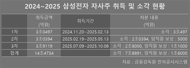 이에 따라 삼성전자는 1차로 지난해 11월부터 올 2월까지 3조497억원 규모의 자사주를 매입해 전량 소각했다. 이어 2차로 올 2월부터 5월까지 3조394억원의 규모의 자사주를 매입하고, 임직원 보상용(5000억원 규모)를 제외한 나머지(2조394억원 규모)는 소각을 완료했다. 3차 자사주 매입은 당초 예정보다 한 달 가량 빠른 오는 10월 8일 이사회 전까지 마무리 할 계획이다. 3차 매입 자사주는 소각 2조8000억원, 임직원 보상 1조6000억 등으로 쓰일 예정이다.
