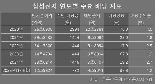 삼성전자가의 특별배당은 2000년이 마지막으로 이후에는 주당 1444원, 배당총액 9조8000억원 수준의 배당이 이뤄지고 있다. 지난해에도 주당 배당금은 1444원, 배당총액은 9조8108억원이었다. 배당성향은 29.2%, 배당수익률은 2.7%다.
