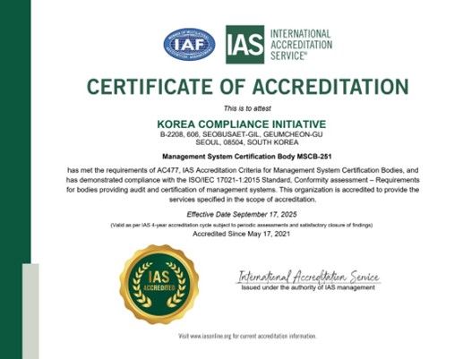 한편, 한국준법진흥원은 ISO 경영시스템, ESG, 공정거래 자율준수프로그램(CP) 등 다양한 분야에서 기업의 준법·윤리경영 체계 구축을 지원하는 전문 인증·교육기관이다. 다수의 국내외 기업 및 공공기관을 대상으로 한 인증 경험을 보유하고 있으며, IAS를 포함한 국제 인정기관들로부터 인증 역량을 인정받으며 글로벌 경쟁력을 확보하고 있다.