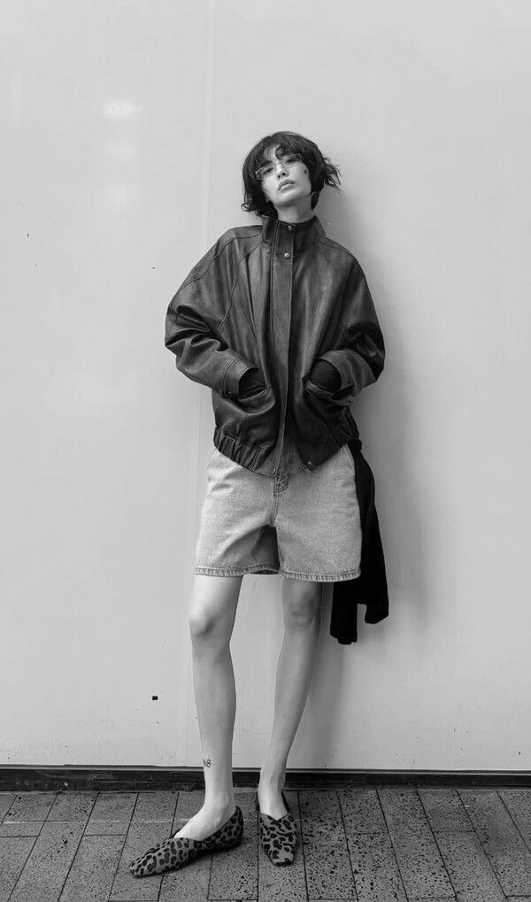 사진 속 나나는 가죽 자켓을 입고 있다.