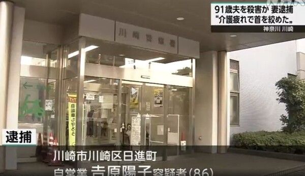 뉴시스 보도에 따르면, 26일 일본 TV아사히에 따르면 자영업자인 요시하라 요코(86) 용의자는 전날 오전 가와사키시 가와사키구에 위치한 자택 맨션에서 남편 요시하라 키요시(91) 씨의 목을 졸라 살해한 혐의를 받고 있다.