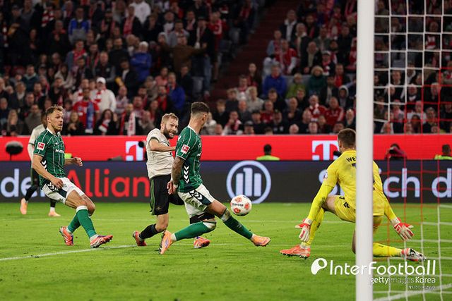 뮌헨이 기회를 놓쳤다. 전반 4분 상대의 백패스를 가로챈 올리세가 전방으로 패스를 연결했다. 쇄도한 케인이 오른발로 슈팅했으나 헤인이 막아냈다. 뮌헨은 전방 압박 강도를 높여가며 브레멘을 위협했다. 뮌헨이 땅을 쳤다. 전반 15분 고레츠카가 시도한 중거리 슈팅은 수비 맞고 나갔다.