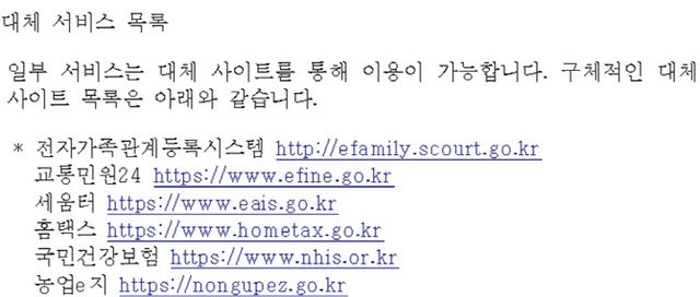 전자가족관계등록시스템, 홈택스, 국민건강보험 등은 대체 사이트를 통해 이용할 수 있다. 대체 사이트 목록은 네이버 공지를 통해 확인할 수 있다.