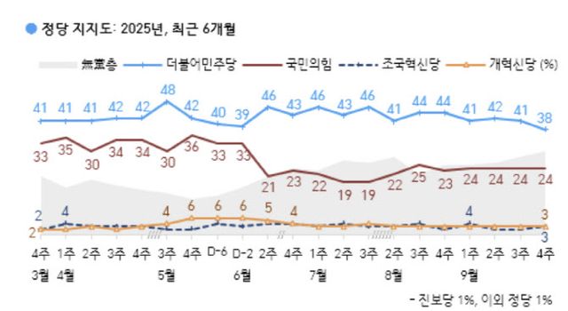 26일 한국갤럽이 이달 23~25일 전국 만 18세 이상 1002명을 대상으로 조사한 결과, 정당 지지도는 더불어민주당 38%, 국민의힘 24%, 조국혁신당·개혁신당 각각 3%, 진보당 1%였습니다. 무당층은 30%로 집계됐습니다. 민주당은 8월 셋째 주 44%에서 38%로 떨어졌지만, 국민의힘은 평균 24%로 큰 변화가 없었습니다. 민주당을 떠난 유권자가 국민의힘을 선택하지 않고 있는 겁니다.