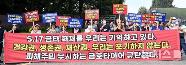 비대위는 "주민들은 지난 5월 발생한 금호타이어 대형 화재로 현재까지 분진과 유해물질 속에서 고통받고 있다. 집 안 곳곳에 검은 분진이 쌓이고, 기침·호흡곤란·피부질환 속에 병원 진료를 받아야 한다"고 주장했다.