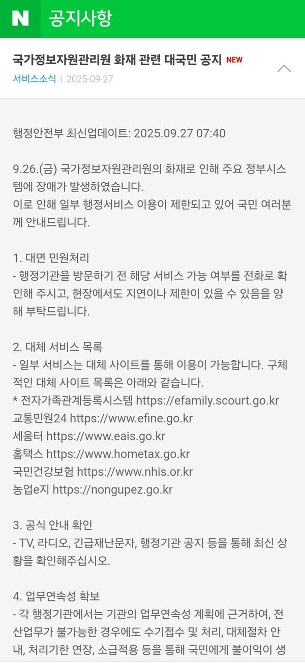 국가정보자원관리원(국정자원) 화재로 우체국, 정부24 등 주요 업무시스템 647개가 중단된 가운데 네이버와 다음이 대국민 공지 창구로 이용되고 있다.