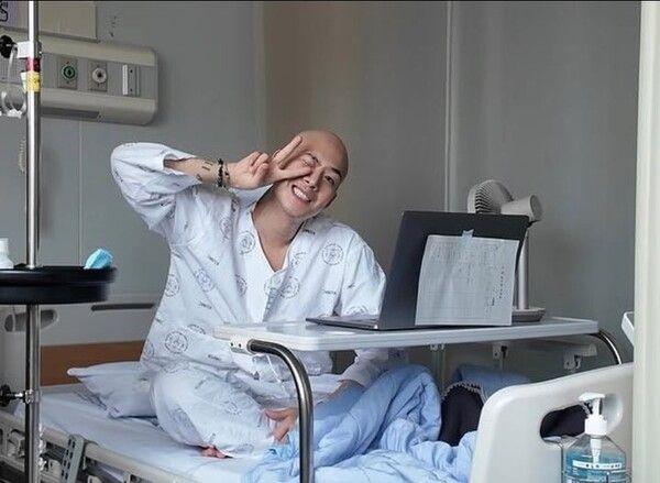 공개된 사진 속 차현승은 병원 환자복을 입은 채 침대에 앉아 환하게 웃으며 브이 포즈를 취하고 있다. 투병 중에도 밝은 모습을 잃지 않으려는 의지가 전해진다.