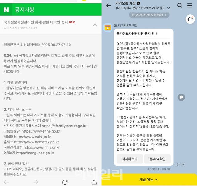 행정안전부는 27일 국가정보자원관리원(국정자원) 전산실 화재로 인해 정부24, 국민신문고, 모바일 신분증 등 총 647개 행정서비스 시스템이 중단됐다고 밝혔다. 이후 네이버 공지 영역과 카카오톡 지갑 채널을 통해 화재 상황 및 대체 이용 방법을 알리는 안내문을 게시했다.