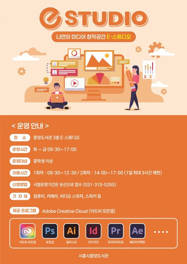 시흥시중앙도서관은 시민들의 미디어 창작 활동을 적극 지원하기 위해 도서관 3층에 위치한 이(e)-스튜디오에 어도비 크리에이티브 클라우드(Adobe Creative Cloud)를 도입해 지난 25일부터 시범 운영을 시작했다.