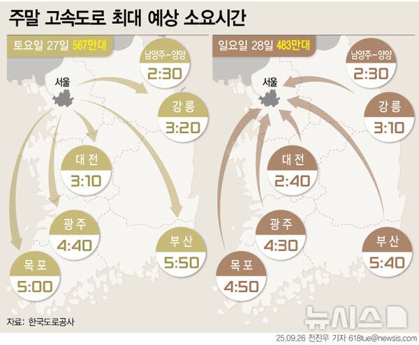 뉴시스 보도에 따르면, 한국도로공사에 따르면 이날 전국 고속도로 교통량은 483만대로 예상된다. 지방에서 수도권으로 진입하는 차량은 41만대, 수도권에서 지방으로 빠져나가는 차량은 39만대다.