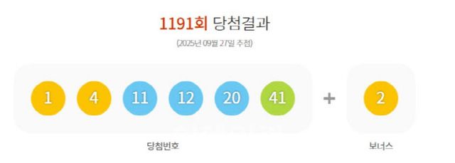 27일 제1191회 로또 추첨 결과 1등 당첨번호는 ‘1·4·11·12·20·41’이며, 보너스 번호는 ‘2’로 결정됐다.