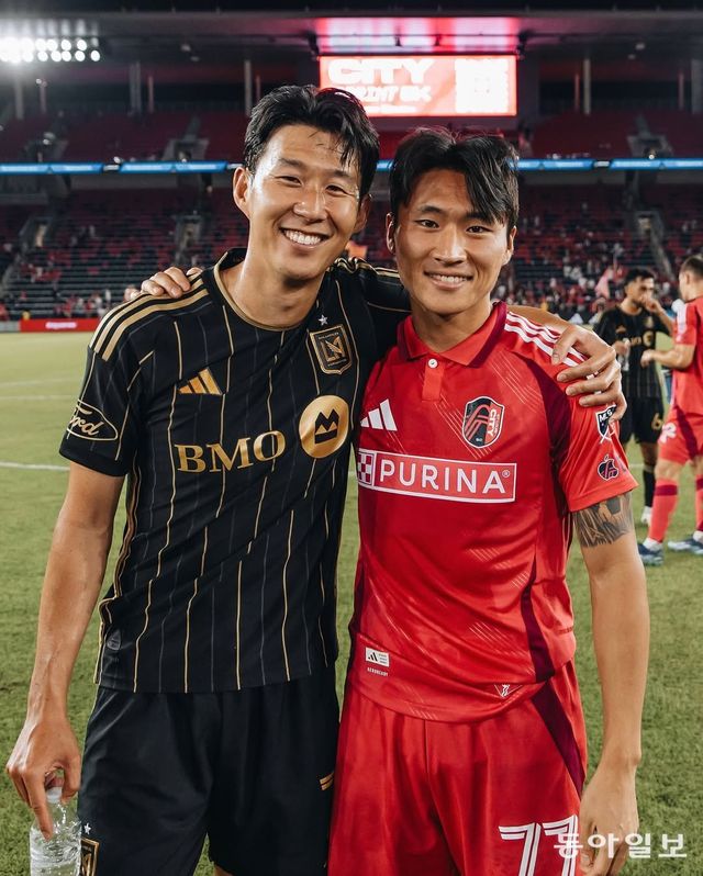 미국 메이저리그사커(MLS)에서 ‘코리안 더비’를 펼친 LA FC 손흥민(왼쪽)과 세인트루이스 정상빈이 기념 촬영을 하고 있다. 사진 출처 LA FC 인스타그램