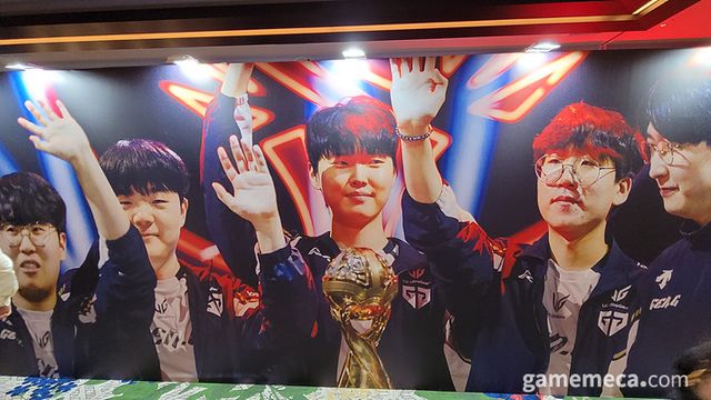 ▲ 입구에는 결선에 진출한 kt롤스터, 젠지, 한화생명e스포츠가 기다리고 있다 (사진: 게임메카 촬영)
