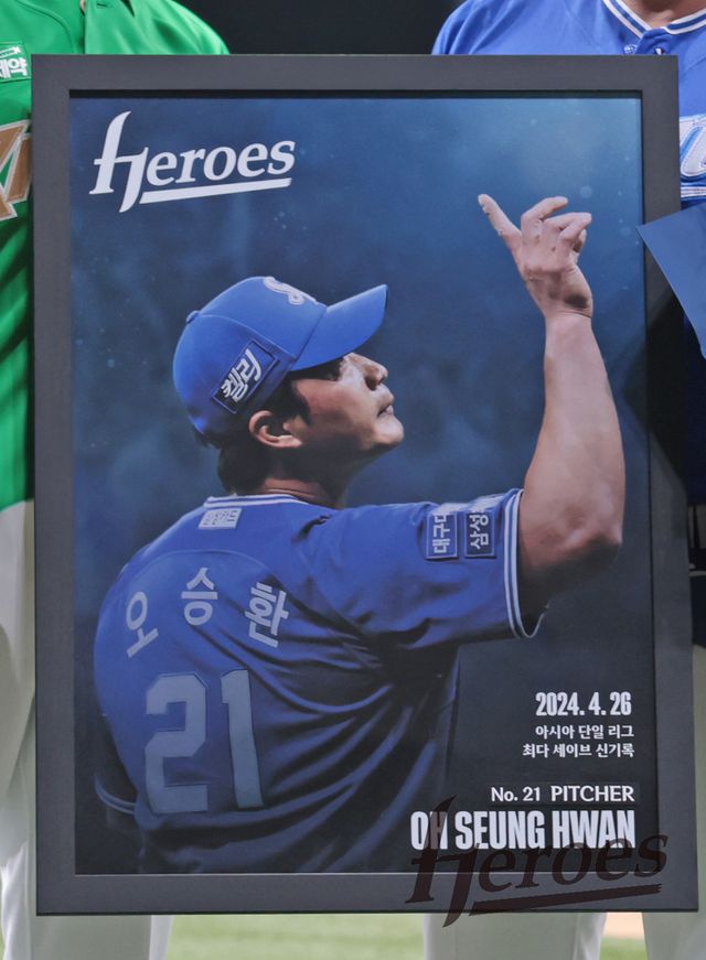 또 키움은 오승환을 위한 대형 액자도 함께 선물했다. 액자엔 지난 2024년 4월 26일 고척에서 달성한 아시아 단일 리그 최다 세이브 기념 사진이 담겨 있었다. 키움 구단은 "오승환 선수가 고척 스카이돔에서 이뤄낸 역사적인 순간을 오래 기억할 수 있도록 액자를 제작했다"고 전했다.