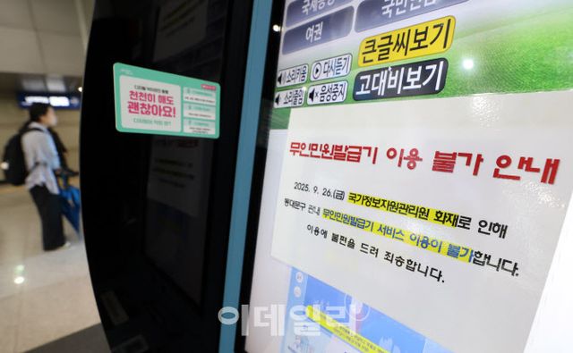 [이데일리 방인권 기자] 국가정보자원관리원 대전 본원 전산실에서 발생한 화재로 정부 업무 시스템 647개의 가동이 중단되고 있는 가운데 28일 오전 서울 청량리역 무인민원발급기에 이용불가 안내문이 붙어 있다. 정부는 이번 화재가 국정자원의 무정전 전원장치 배터리를 지하로 이전하기 위한 작업 중, 전원이 차단된 배터리 1개에서 발생했다고 원인을 설명했다. |