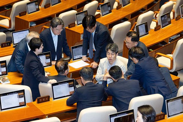 윤건영 국회 행정안전위원회 더불어민주당 간사를 비롯한 여당 위원들이 27일 서울 여의도 국회에서 열린 제429회 국회(정기회) 제9차 본회의에서 국가정보자원관리원 화재 관련 논의를 하고 있다. / 뉴스1
