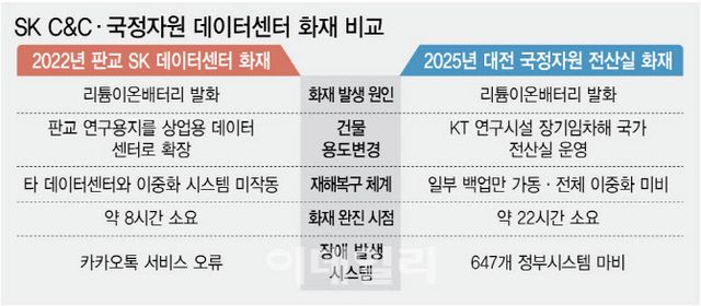 28일 이데일리 취재를 종합하면 지난 26일 국가정보자원관리원 대전본원 화재로 촉발된 정부 전산시스템 장애 사태는 3가지 측면에서 판교 SK 데이터센터 화재 사고와 닮았다. 예고된 참사일 수 있다는 의미다.