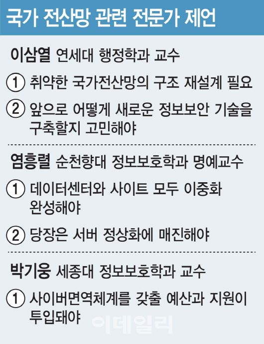 전문가들은 단기적으로는 일상회복을, 장기적으로는 전산망 이중화와 사이버보안 기술력을 확보해야 한다고 강조했다. 염 교수는 “우선은 당장 일상생활이 시작되기 때문에 정부는 우선순위를 잘 정해서 서버 정상화에 투입할 수 있는 자원과 인력을 잘 안배해야 한다”며 “이후에는 이중화 체계를 완전히 갖춰야 한다. 자신이 없다면 공공망을 안전성과 보안기술이 확실한 민간 클라우트 서비스에 넘겨서 운영 부담을 줄이는 것도 고려해야 한다”고 제언했다.
