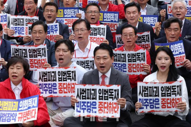 서울 중구 세종대로에서 열린 국민의힘 ‘사법파괴 입법독재 국민 규탄대회’에는 당 추산 15만 명이 몰리며 시청역 앞부터 숭례문까지 인파가 가득 찼다. 참가자들은 ‘헌법파괴 의회독재 사법장악 규탄한다’는 피켓을 들고 민주당을 향해 중단을 요구했다. 지난 21일 동대구역 집회(7만 명)보다 약 8만 명 더 많은 규모다. 다만, 경찰은 집회 참석 인원을 1만 1000명으로 추산했다.