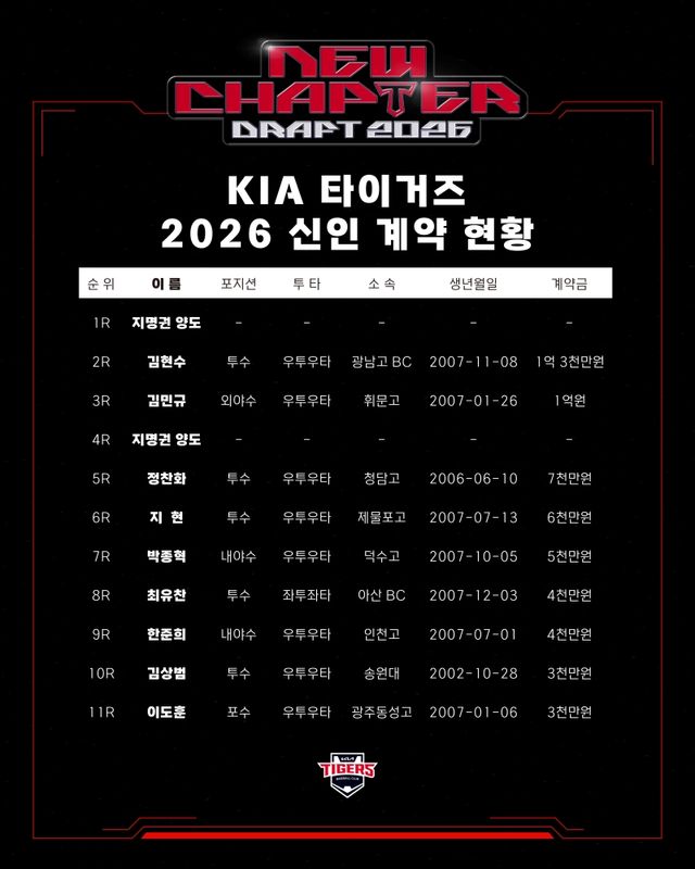 KIA는 28일 광주-KIA챔피언스필드에서 열리는 2025 신한 SOL Bank KBO리그 NC 다이노스와의 시즌 16차전을 앞두고 "2026년도 신인 선수 9명과 입단 계약을 마무리했다"고 발표했다.