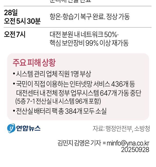 이 가운데 96개는 화재로 직접 피해를 본 시스템이며, 나머지 551개는 전산실 항온·항습기가 꺼지자 보호를 위해 선제적으로 가동을 중단한 시스템이다.