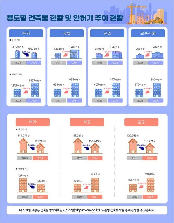 뉴시스 보도에 따르면, 29일 국토교통부에 따르면 2024년도 전국 건축물의 동수는 지난해보다 3만519동(0.4%) 증가한 742만1603동으로, 연면적은 전년 대비 8732만7000㎡(2.1%) 증가한 43억1498만7000㎡로 나타났다. 이는 축구장(7140㎡) 기준 약 1만2231개, 잠실 야구장(2만6331㎡) 기준 약 3317개에 달하는 면적이다.