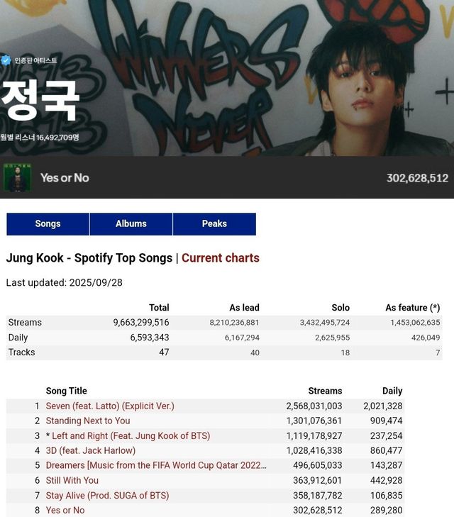 특히 방탄소년단 앨범의 솔로곡 ‘Euphoria’까지 더하면, 정국은 스포티파이에서 3억 이상 스트리밍된 곡만 9곡을 보유하게 됐다. ‘Yes or No’는 공식 뮤직비디오조차 없는 상황에서도 유튜브 뮤직에서 1억 스트리밍을 기록하며, 전 세계적인 음원 파급력을 다시 한번 입증했다.