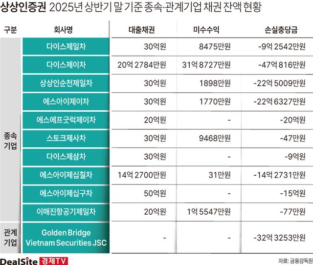 손실충당금 규모는 다이스제이차가 47억원으로 가장 많았고, 골든브릿지 베트남 증권이 32억원으로 뒤를 이었다. 이외에 △상상인순천제일차(23억원) △에스아이제이차(23억원) △에스에프굿럭제이차(20억원) △에스아이제십구차(15억원) △에스아이제십칠차(14억원) 등이 수십억원의 충당금을 쌓았다.