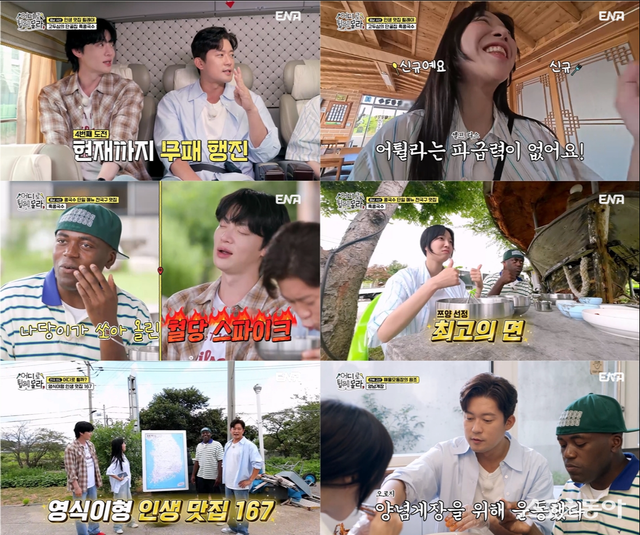 28일 방송한 ENA 예능프로그램 ‘어디로 튈지 몰라’에서는 김대호, 안재현, 쯔양, 조나단의 롤러코스터급 난이도의 즉흥 맛집 릴레이가 펼쳐졌다. 이들은 충청북도 서산에서 시작해 전라북도 남원까지 달려가는 맛집 릴레이 속에서, 맛집 사장님과의 뜻밖의 인연을 발견하고, 제작진 없이 혈혈단신 촬영을 감행하는 등 리얼 그 자체가 주는 버라이어티한 재미를 선사했다.
