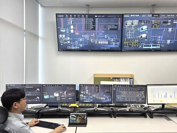 LG전자 BEMS_풀무원기술원: LG전자 건물에너지관리시스템(BEMS)이 설치된 풀무원기술원이 건물에너지관리시스템(BEMS) 설치확인 1등급을 재획득했다. 직원이 풀무원기술원의 에너지 흐름을 모니터링하고 있다. /LG전자 제공