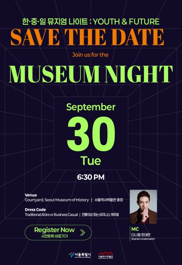 심포지엄 종료 후에는 ‘한중일 뮤지엄 나이트 : YOUTH & FUTURE’가 박물관 중정에서 열린다. 일본·중국 박물관 대표, 주한외국공관, 국내 박물관 관계자 등 100여명이 참석해 청년 대표단 수료식, 네트워킹 파티, 전시·체험 프로그램 등을 함께한다. 사회는 방송인 겸 서울시 홍보대사 다니엘 린데만이 맡는다.