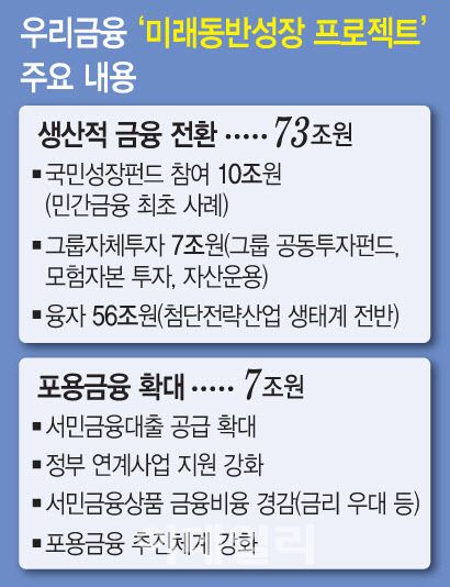 생산적 금융 73조원은 국민성장펀드 참여 10조원, 그룹자체투자 7조원, 융자 56조원으로 구성했다. 이 중 국민성장펀드 10조원은 지난달 10일 이재명 대통령이 국민보고대회에서 국민성장펀드 150조원을 제시한 이후 민간 첫 추진 사례다. 민간·국민기금 75조원의 약 13%에 달하는 규모다. 우리금융그룹 자체투자 7조원은 그룹 공동투자펀드 1조원, 증권 중심 모험자본 투자 1조원, 자산운용 계열사의 생산적 금융 펀드 5조원 등으로 추진한다. 또 융자 56조원은 K-테크(Tech) 프로그램 19조원, 지역소재 첨단전략산업 육성 16조원, 혁신 벤처기업 지원 11조원, 국가주력산업 수출기업 지원 7조원, 우량 중소기업 첨단인력 양성과 소상공인 금융 지원 3조원 등으로 구성했다.