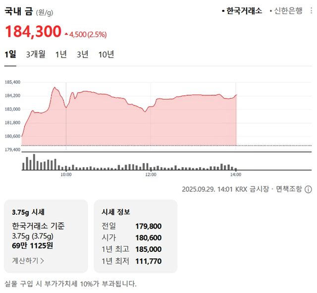 국내 금시세(금값)가 29일(한국 시각) 오후 상승세(전 거래일 대비)를 보이고 있다.