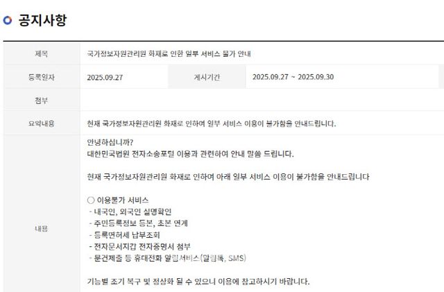 29일 법조계에 따르면 이번 화재로 인해 법원의 일부 서비스도 이용에 어려움을 겪고있다. 대한민국 법원 전자소송포털 홈페이지는 △내·외국인 실명확인 △주민등록정보 등본·초본 연계 △등록면허세 납부조회 △전자문서지갑 전자증명서 첨부 △문건제출 등 휴대전화 알림서비스 등이 제공되지 않고 있다. 전자소송포털은 재판의 기본적인 정보를 제공하고 소송 관계자들이 소장과 증거 등 서류를 인터넷으로 제출할 수 있도록 하는 인터넷 사이트다.