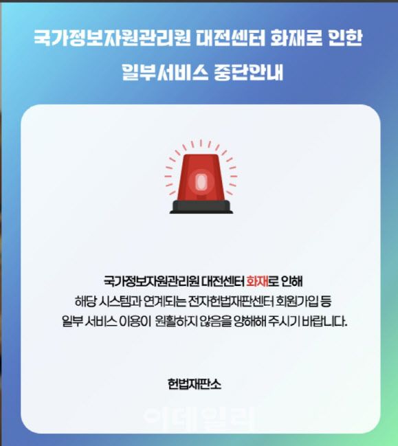 헌법재판소 역시 화재로 인해 일시적으로 회원가입이 불가했다가 원활하진 않지만 복구가 된 상태다.