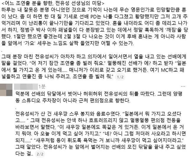 이어 "분장 마친 전유성 씨가 아차차 하고 의자에서 일어서면서 열을 내고 있는 선배에게 말을 걸었다. '일본에서 뭘 가지고 온 게 있는데 매니저가 이리로 갖고 오기로 했거든. 여기 MC하고 패널들하고 연출진 좀 나눠 주려고. 조연출 좀 빌려줘'라고 했다"며 "덕분에 선배의 닦달에서 벗어나 전유성 씨의 뒤를 따랐다. 근데 양평동 스튜디오 주차장이 아니라 근처 편의점으로 향했다"고 전했다.