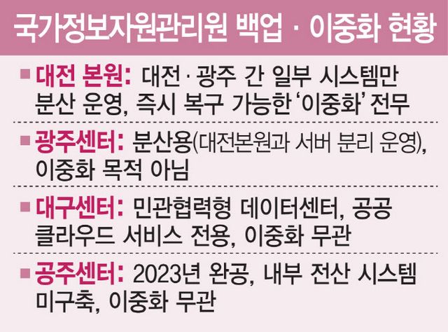 국가정보자원관리원은 대전 본원과 광주·대구·공주 등 3개 센터를 운영 중이지만, 모두 이중화 기능을 갖췄다고 보기 어렵다. 광주센터는 일부 백업만 담당하는 제2센터 성격에 가깝고, 대구센터는 민관협력형 클라우드(PPP)로 민간 사업자가 입주한 시설이다. 공주센터는 2023년 완공됐지만 개소가 미뤄져 아직 가동되지 않고 있다.