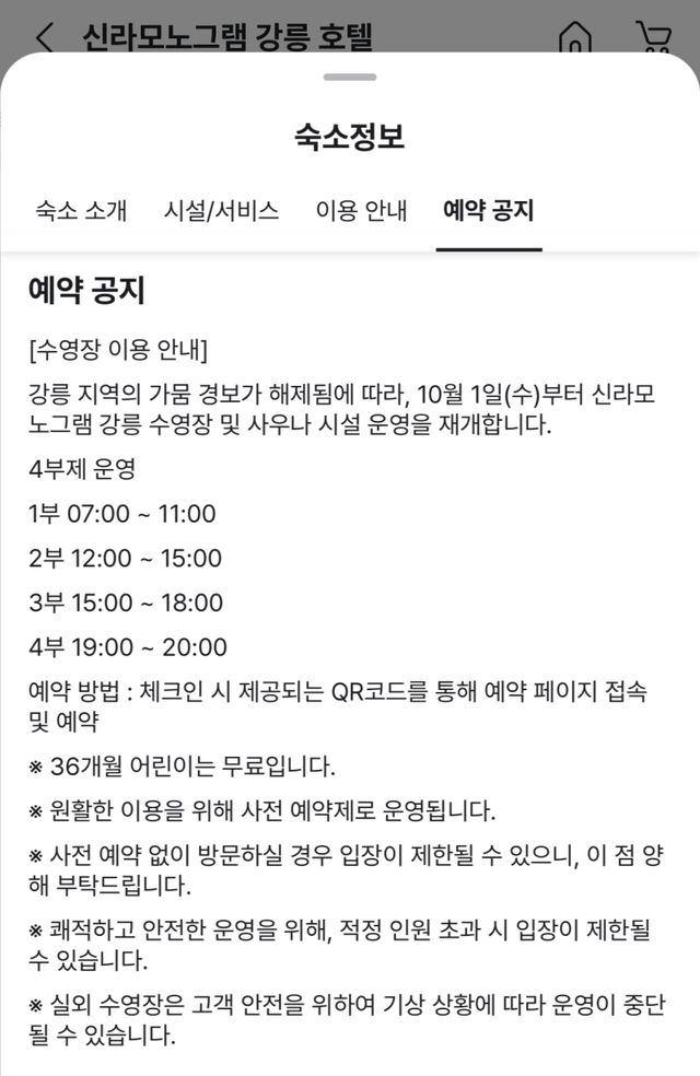신라모노그램 강릉이 수영장과 사우나 등 물 사용 부대시설에 대한 운영을 10월 1일부로 재개한다.