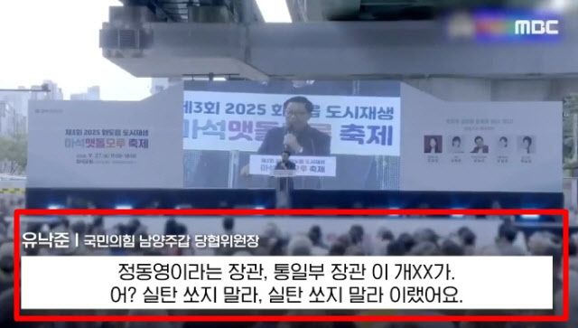 29일 지역 정계에 따르면 27일 국민의힘 남양주갑 유낙준 당협위원장은 축사하기 위해 오른 단상에서 “정동영이라는 장관, 통일부 장관 이 개XX가”라며 막말을 퍼부었다.