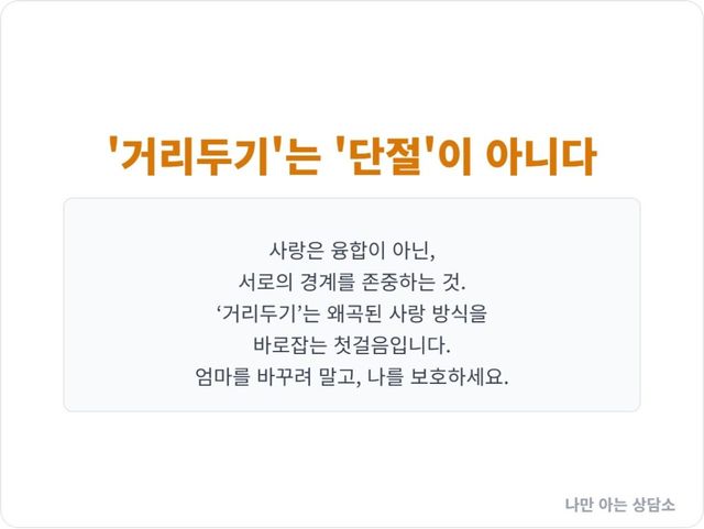 따라서 건강한 거리두기는 사랑을 저버리는 행위가 아니라, 오히려 왜곡된 사랑의 방식을 바로잡고, 진정한 의미의 독립된 사랑으로 나아가는 첫걸음이다.