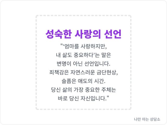 “엄마를 사랑하지만, 내 삶도 중요하다”는 말은 변명이 아닌 선언이다. 그것은 당신이 마침내 당신 인생의 가장 중요한 주체가 당신 자신임을 인정하는 성숙의 증거다. 건강한 거리두기는 이기적인 행동이 아니라, 모두를 위한 가장 지혜로운 사랑의 방식이다. 당신은 엄마를 사랑할 수 있다. 단, 당신의 삶을 파괴하지 않는 안전한 거리에서.