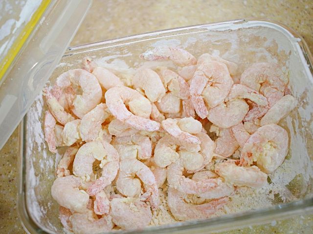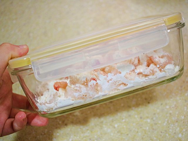 계란 흰자 코팅한 새우를 밀폐용기에 담고