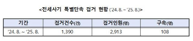 경찰청은 2024년 8월부터 2025년 8월까지 전세사기 사범 2913명을 추가 검거했다. 이 중 108명은 구속됐다. 특히 무자본 갭투자와 전세대출 사기 등 대규모 조직 범죄 6건에 대해 검거한 282명과 구속된 13명에는 형법상 ‘범죄단체 조직죄’를 적용했다. 같은 기간 피해 회복을 위해 기소 전 몰수·추징 보전액도 538억원에 달했다.