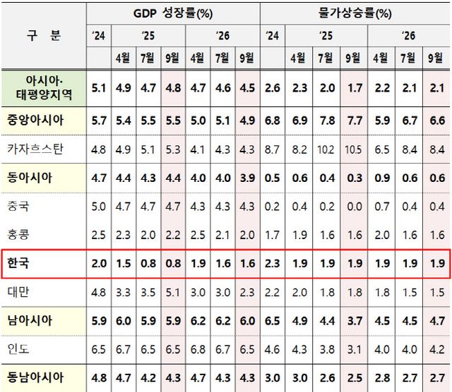 아시아·태평양지역 물가 상승률의 경우 올해는 국제 유가 및 식료품 가격 하락 등의 영향으로 물가가 안정화될 것으로 예측하며 7월 전망보다 0.3%포인트 내린 1.7%로 전망했다. 내년엔 2.1%로 7월의 전망을 유지했다.