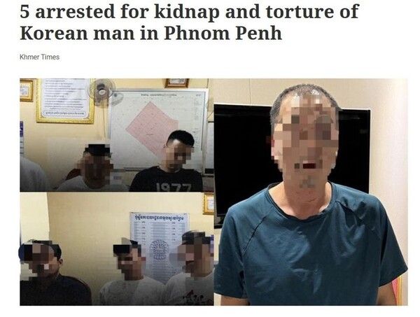 뉴시스 보도에 따르면, 현지 매체 크메르타임스 보도에 따르면 프놈펜 경찰은 지난 22일 51세 한국인 남성 A씨를 감금·고문한 혐의로 용의자 5명을 붙잡았다고 밝혔다. 체포된 용의자는 30~40대 중국인 4명과 30대 캄보디아 남성 1명(운전사) 등 총 5명이다.