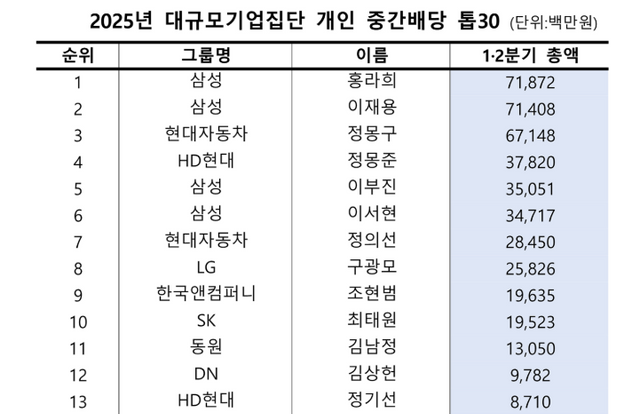 HD현대의 최대주주 정몽준 아산사회복지재단 이사장은 378억원을 받아 4위에 자리했다. 이부진 호텔신라 사장이 351억원, 이서현 삼성물산 사장이 347억원을 받으며 각각 5, 6위를 차지했다.