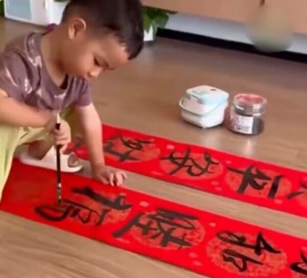 뉴시스 보도에 따르면, 27일 홍콩 사우스차이나모닝포스트(SCMP)에 따르면 중국 남부 광둥성에 거주하는 어린 소년 랑랑(3)이 붓을 들고 붉은 두루마리 종이에 글씨를 쓰는 영상이 현지 SNS에서 큰 화제를 모으고 있다.